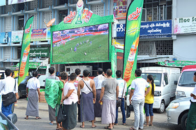 ျမန္မာအသင္း၏ ေဘာလံုးပြဲစဥ္မ်ားကို ပရိသတ္မ်ားတစုတေပါင္းတည္း တိုက္႐ိုက္ၾကည့္႐ႈႏုိင္သည့္ အစီအစဥ္ကို ရန္ကုန္ၿမိဳ႕ လွည္းတန္းေစ်းေရွ႕၌ ျပသေပးေသာ္လည္း ကားလမ္းတစ္ဖက္ျခမ္းတြင္ ျပသျခင္းျဖစ္ေသာေၾကာင့္ ပရိသတ္မ်ားအဆင္ေျပေျပ ၾကည့္႐ႈႏုိင္ျခင္းမရွိေပ။